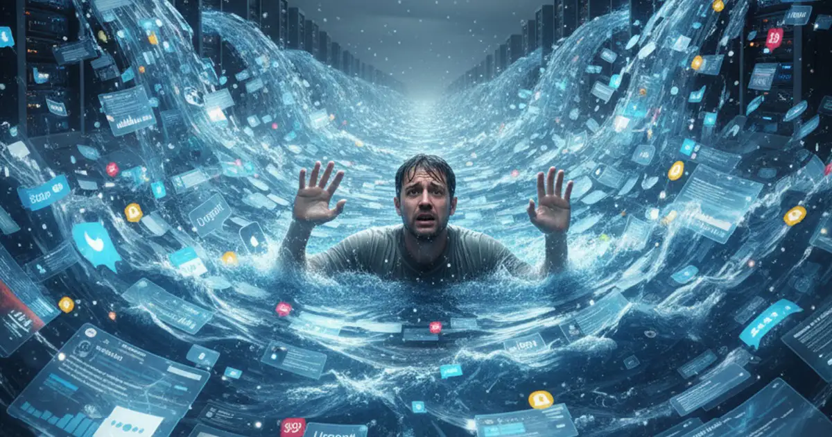Person submerged in a digital ocean of notifications, social media icons, and app windows, symbolizing information overload and digital fatigue.Digital fatigue has become a major challenge for modern subscription businesses. As inboxes become crowded and ad blockers grow more common, brands struggle to maintain visibility with their customers. This environment makes customer churn one of the most expensive problems facing subscription businesses.